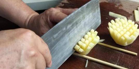 今天小編帶給大傢的是土豆的新吃法,土豆這麼做,肉都比不上,逼格高到你都舍不得咬一口!土豆去掉外皮,然後對切兩半,具體操作可以參照下面的方法,很簡單的!每切一刀,再斜切掉一刀,使花掰層次清楚!
