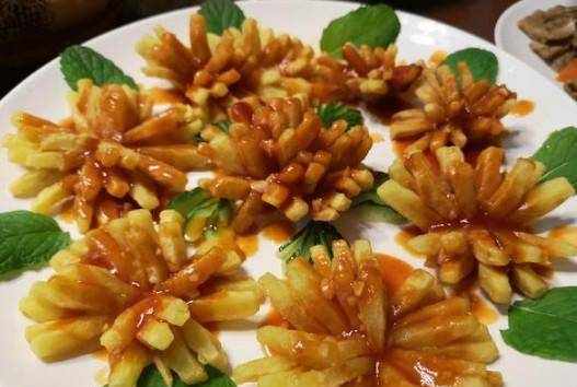 切好之後的土豆就已經很漂亮瞭,是不是很期待成品瞭呢?放進鹽水裡面,水浸泡發軟,然後撈出控幹,放面粉拌幹,然後炒鍋放油,將土豆放進油鍋,炸一下,就像是炸薯條一樣的方法!鍋留底油放蒜末沙司鬥沙香加糖,鹽少量,醋水勾芡淋入菊花薯條上即成。