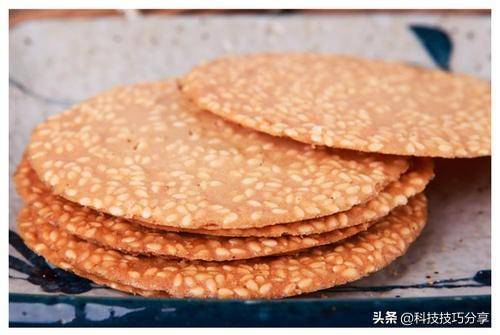 第二,芝麻薄脆餅。食材:面粉1碗、雞蛋2個、白糖2勺、黑白芝麻個1勺。做法:雞蛋、白糖、黑白芝麻備好。面粉中磕入雞蛋,放入白糖,黑白芝麻。無需加水,攪拌面絮,再和成面團,靜置一會。搟成薄面片,用水杯口壓制成圓片,多餘的面團可反復使用,直至全部面團用完。用搟面杖再搟薄點。準備平底鍋,不用抹油,放入餅胚,小火烙制。烙制兩面金黃。