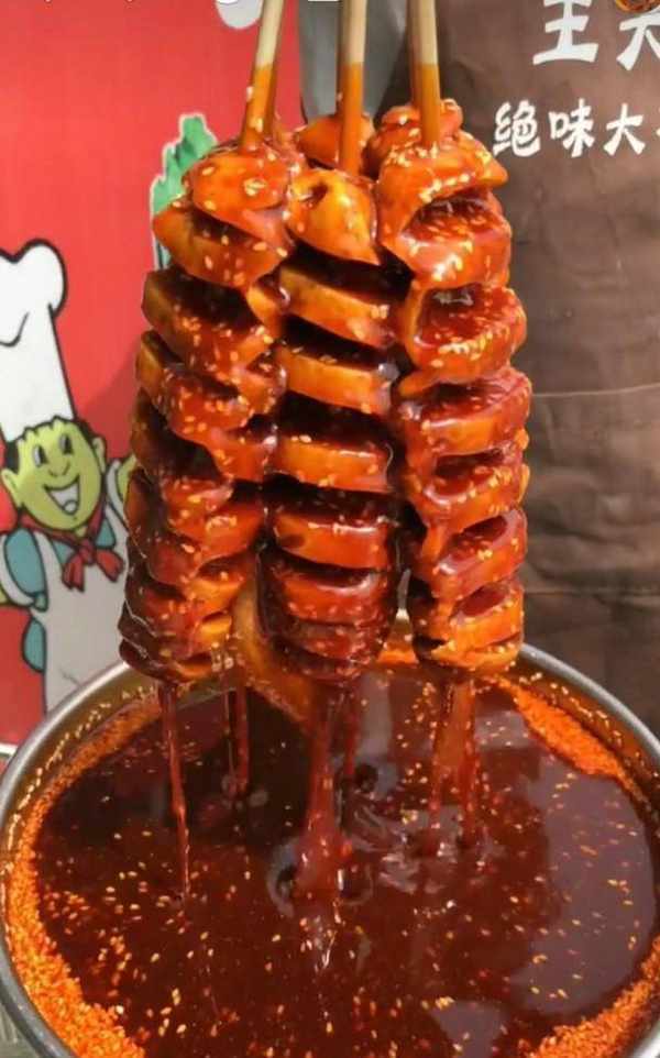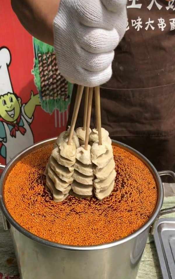 與此同時,“烤面筋”這道燒烤中的常規菜也走上瞭網紅之路。身為吃貨大國中的一員,幾乎每個中國人對於美食都有著飽滿的熱情。網紅大面筋,這種大面筋目前在河南、山東、東北等北方地區是比較吃香的,因為這種面筋是自己手工做的,首先看著就與眾不同,也比較過癮啊。大傢可以看到圖片上大面筋在一桶滿滿的紅油裡面涮一下出來,在淋油,表面沾著芝麻,加上紅油的誘惑,雖然這隻是個半成品,但已經很誘人瞭。