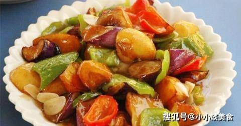 4、熱油將蔥花和蒜末爆香,加入高湯、少許醬油、糖、鹽、茄子、土豆和青椒,稍炒片刻。