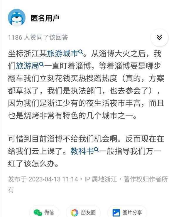但是據知乎網友爆料,他是浙江某城市旅遊局的,已經出策劃方案,準備狙擊淄博,隻要淄博燒烤出現負面信息,馬上買熱搜,搶占其風頭,蹭熱度。