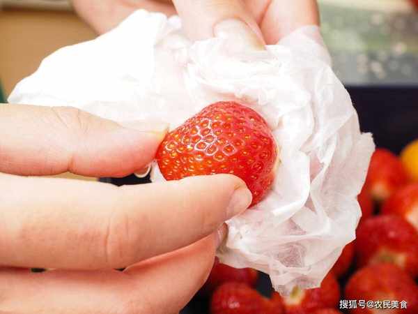 3、洗凈的草莓用吸水紙輕輕擦幹或放在幹凈的廚房毛巾上風幹。
