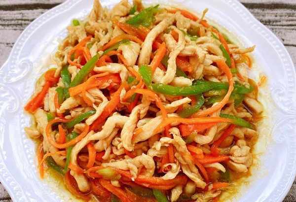 材料:雞胸肉、胡蘿卜、青椒、洋蔥、大蒜、醬油、蠔油、料酒、淀粉、鹽、雞精。