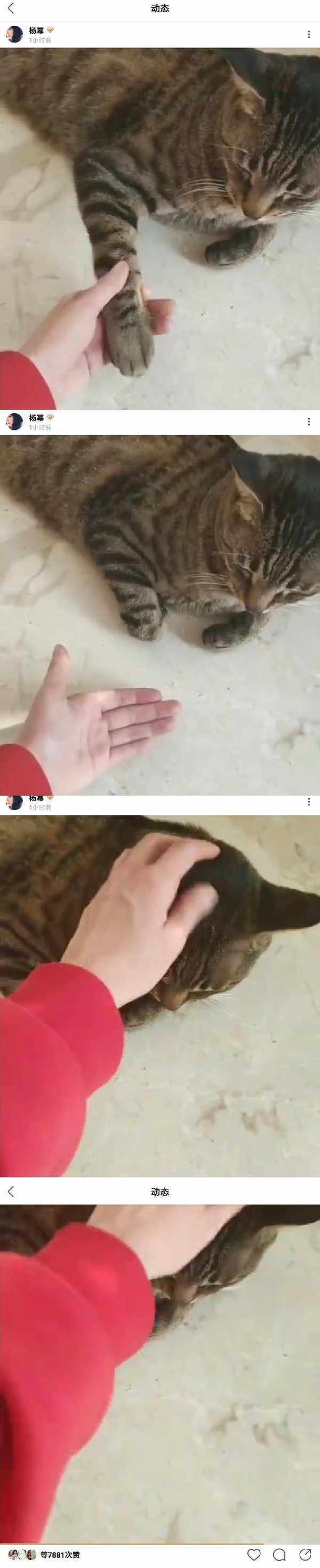 楊冪在假期的時候解鎖的另外一個身份就是寵物博主,單純的逗逗傢裡的鳥,已經不能滿足楊冪瞭,現在她終於是對傢中的小貓咪下手瞭,之前楊冪就在自己的社交平臺上曬出自己和傢中貓咪的互動,盡管貓咪面對楊冪的示好是愛搭不理的,但是這絲毫不能衰退楊冪對她的喜歡,最後牽完小貓的手之後,還給小貓來瞭一記甜蜜的摸頭殺,頭一次產生羨慕一隻貓的感覺。