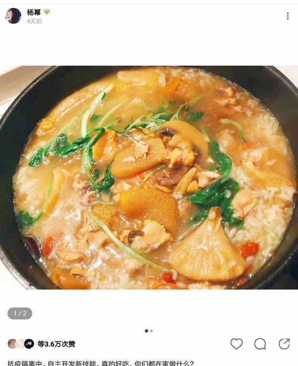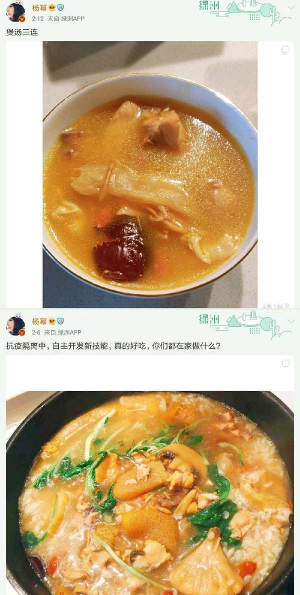 但是萬萬沒有想到的是,楊冪的廚藝竟然會這麼的好。本來以為像楊冪這麼忙的大明星,基本上都是十指不沾陽春水的,但是沒有想到楊冪也會自己下廚。而且看楊冪做出來的菜成品都是相當的有賣相,在這裡你可不要以為女明星的日常隻會有各種的蔬菜,各種的雞身材肉,事實上楊冪也是一個很愛吃飯的人,她做的飯菜裡面基本上全都是高碳水,高熱量的,像是這一道湯泡飯,那可是長肉的標配啊。
