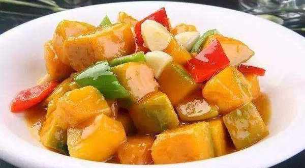 3、將南瓜放入鍋中,用大火煎片刻。待表面微焦時,加入1湯匙蠔油和1湯匙生抽,攪拌均勻。