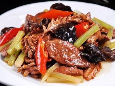 7、炒香後,將醃好的豬肝和裡脊肉放入鍋中,開大火煮十秒,然後加入泡椒翻炒幾下均勻,再放入香菇切片大蔥。