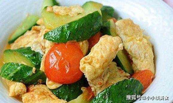 4、煎蛋放一邊,加少許油,將黃瓜和聖女果倒入鍋中炒至黃瓜微軟。