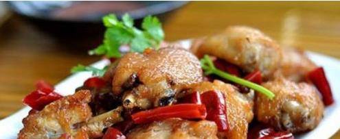 7、加入紅辣椒片,炒至香辣,倒入控油雞翅,炒至熟。