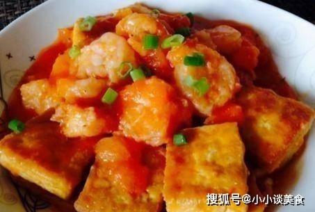 材料:大蝦150克,豆腐500克,小蔥3根,番茄醬,糖,鹽,淀粉;
