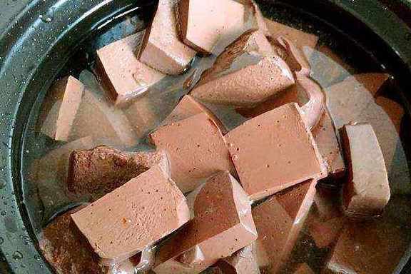 切開後血塊有很大的氣孔,焯水後顏色會發黑,也比較容易鬆散。