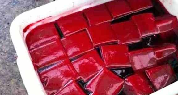 ②用少量的真猪血添加一些澱粉,鹽和添加劑,算得上是加工類的血製品,稱為"血豆腐";這樣的猪血更加的鮮嫩,成型後不宜碎,勁道有嚼頭,更容易長途運輸。