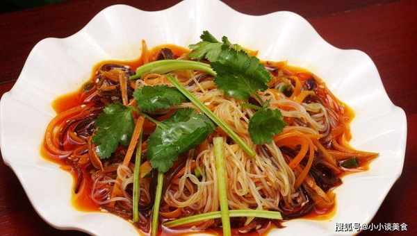 3、香菜、紅辣椒切碎,放入碗中,加入白糖、香醋、生抽、香油、辣椒油、鹽、香油,攪拌均勻後裝盤。