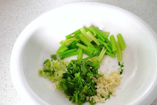 5、香芹焯水3秒鐘、香芹、香菜、蔥花蒜末等待出鍋的時候再放。