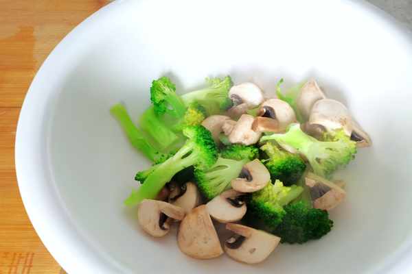 3、把圓菇和西蘭花焯水10秒鐘,去除草酸和雜質。