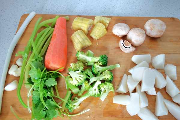 2、再把上面的蔬菜清洗乾淨,山藥、圓菇、西蘭花、玉米、紅蘿蔔切塊,香芹、香菜切段,葱蒜切碎。