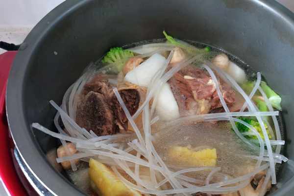 4、30分鐘後,牛排骨燉好了,打開鍋蓋,加入玉米、山藥、西蘭花、圓菇,紅蘿蔔,泡好的粉條,蓋上鍋蓋,再燉2分鐘。