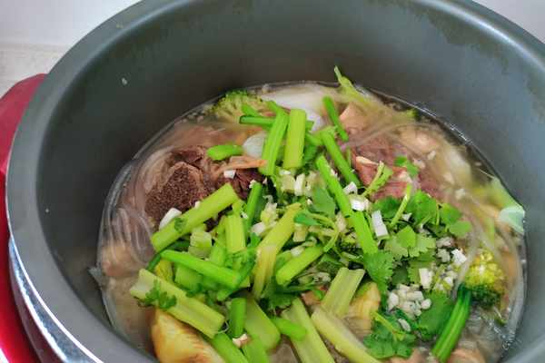 6、2分鐘到了,打開鍋蓋,放上蔥花蒜末香芹香菜出鍋。