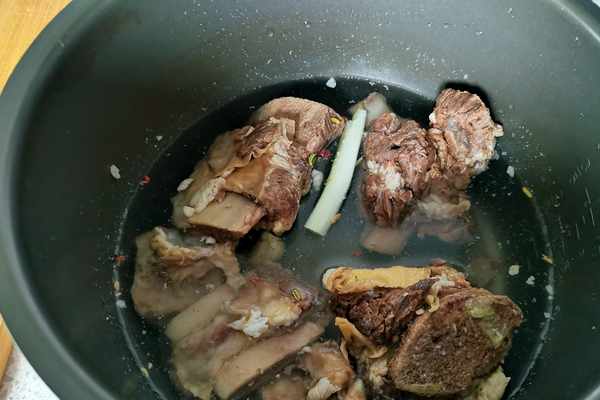 1、牛排骨是公公婆婆拿給我們的,先把牛排焯水,然後放電壓力鍋裡面,加點葱薑蒜、花椒八角茴香,適量鹽,一塊冰糖,按羊排鍵,燉肉30分鐘。