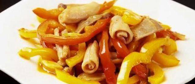 4、起油鍋,放入薑片、蒜末和洋蔥炒香;倒入鴨腸,拌勻;倒入料酒,炒香,加入生抽,拌勻,倒入胡椒粉,炒至碎;