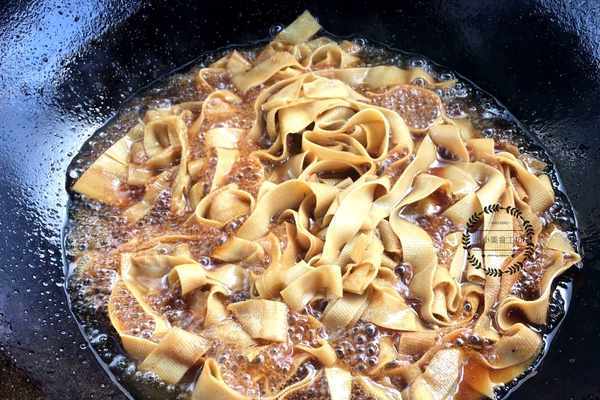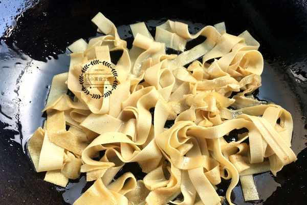 3、香味出來後撈出料渣,把豆皮倒入鍋中翻炒片刻。