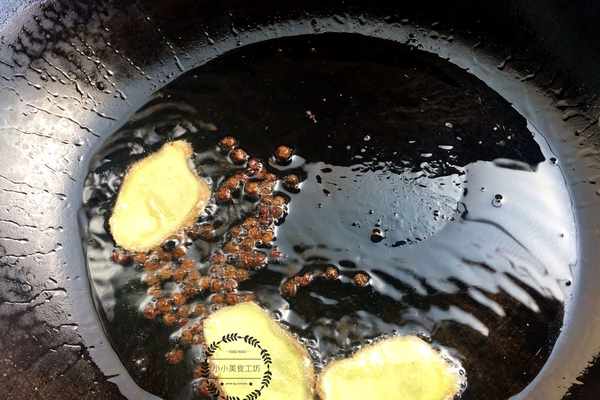 2、鍋中倒入適量油,油熱後倒入薑片和花椒煎出香味。