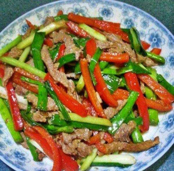原料:牛肉、蒜苗、紅辣椒、鹽、料酒、醬油、雞精