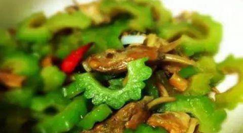 制作方法:1、將苦瓜洗凈,縱向對半切開,去掉果肉和瓜子,斜切成2毫米厚的片。幹辣椒片、蒜茸切碎待用;