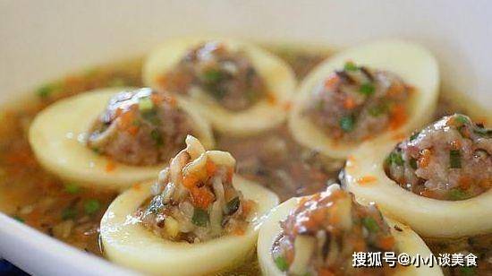 做法:1、雞蛋洗凈,放入一鍋冷水中煮熟。去殼去殼,挖出蛋黃,蛋清留著待用;豬肉碎加入鹽、蠔油、料酒、蔥花,用勺子攪拌均勻;用勺子挖出部分肉餡做成丸子,塞入蛋清中