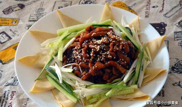 3、鍋中油燒熱,加入準備好的醬汁翻炒,最後放入煮熟8分鐘的肉絲繼續翻炒。上菜前,將切碎的蔥放在盤子裡。