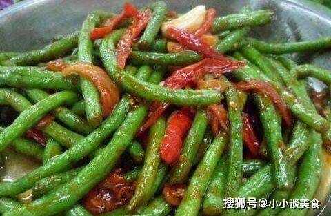 3、熱鍋放油,將蔥、薑、蒜爆香,加入花椒粒和豆角翻炒均勻,至豆角變軟變爛;