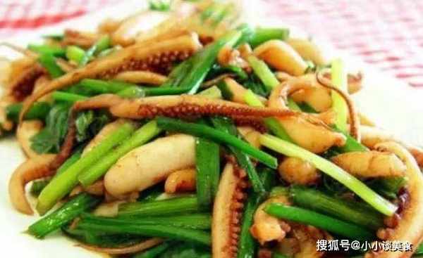 2、鍋內倒入熱水,放入魷魚絲,焯水,撈出涼水瀝幹待用;