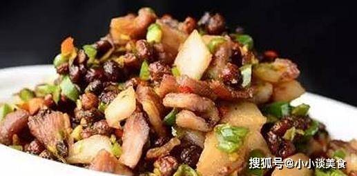 原料:五花肉500克,豆豉100克,小紅椒50克,小青椒150克,薑片,蒜片,蒜葉,鹽,味精。