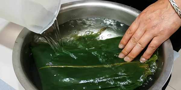 4、煮粽葉:先浸泡粽葉後煮制,煮粽葉時記得加入少許食鹽和小蘇打。