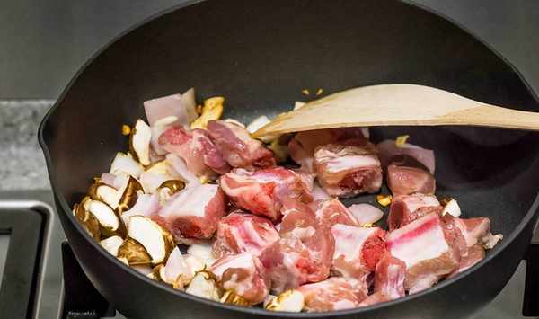 下洗凈瀝幹的排骨生炒至變色;