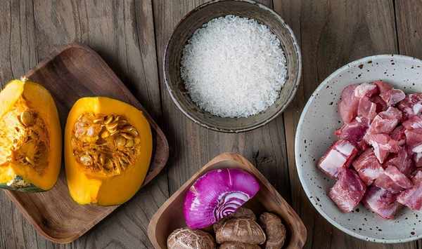 準備食材:南瓜、排骨、大米、洋蔥、香菇、大蒜、鹽、胡椒粉、醬油