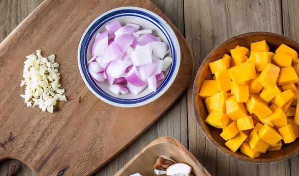 首先將大蒜切末,洋蔥、香菇、南瓜切小塊;
