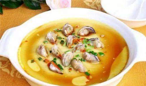 3、盤子抹油,放入煮熟的白花蛤,倒入過篩的蛋液。