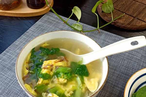 這個湯,估計大傢也沒吃過,生菜雞蛋湯,裡面加瞭幾片木魚花,濃濃的大海的氣息。