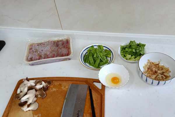平菇、生菜洗凈,雞蛋打散,木魚花一把。