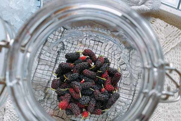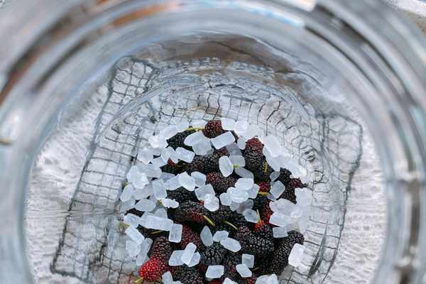 4、準備好的桑葚放進去,在底部鋪上一層桑葚之後,鋪上一層白糖,按照一層桑葚一層白糖的鋪,最上面一層是冰糖;