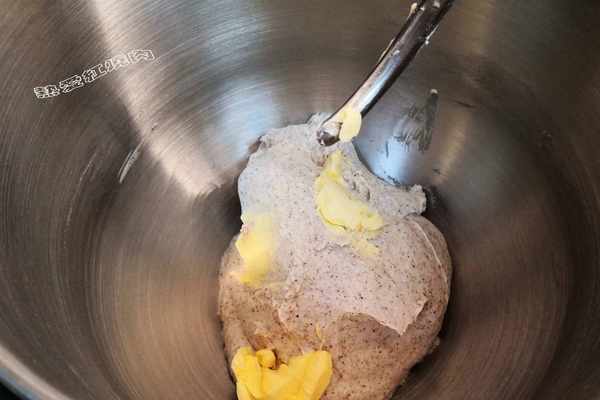 7加入軟化好的16克黃油繼續用6擋揉面6、7分鐘,揉至面團有很好的延展性就可以,不用揉出手套膜。