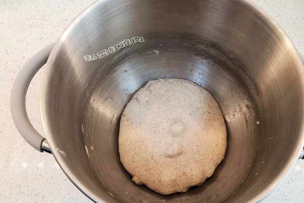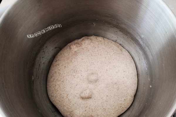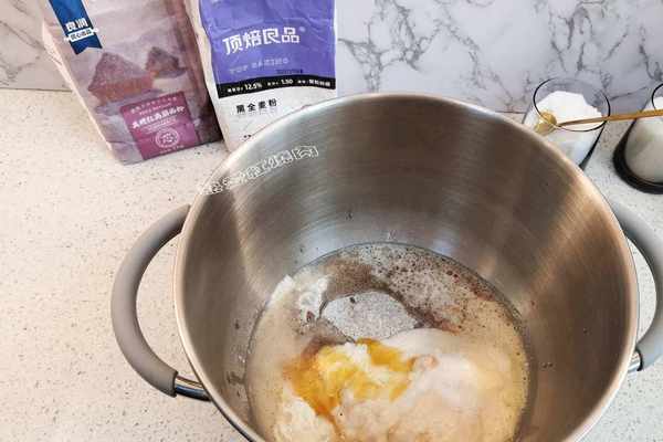 5廚師機揉面盆裡稱好頂焙良品黑全麥粉90克,高筋粉290克,啤酒160克,鮮酵母8克,蜂蜜15克,鹽7克,清水50克,再把波蘭種也倒進去。