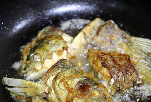 第二步,醃制15分鐘,在鍋中添上稍微多一點的食用油,將油燒熱,放上幾片生薑炒香,將魚塊放入鍋中,魚頭也可以一同下鍋煎一煎燉煮,先用大火煎一下,再轉小火煎;