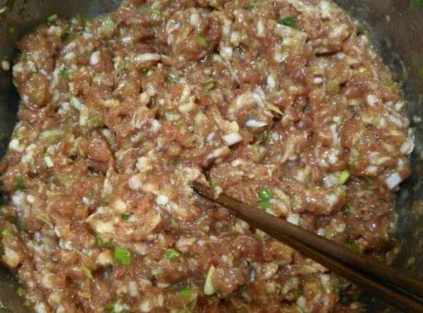 第四步:將適量的鹽、香油、食用油倒入肉餡和白菜中,攪拌均勻成餡。