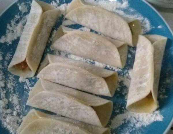 第五步:取一張餃子紙放在手心,中間放入適量的白菜餡,將餃子紙的兩邊放在一起,捏緊,將兩端打開。