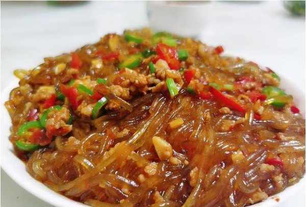 5、煮一會兒,水差不多幹瞭,用鏟子攪拌收汁,加入青椒、雞精、香油關火。