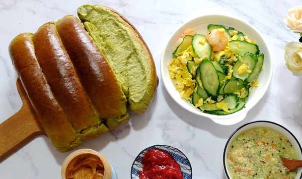 早餐主食是自制面包,這次做的抹茶排包,又香又軟,顏色又好看,全傢都很喜歡。我的主頁裡有很多自制面包食譜,喜歡的小夥伴可以自行查閱。面包可以直接吃,也可以抹上草莓醬或者花生醬食用,孩子們比較喜歡果醬。