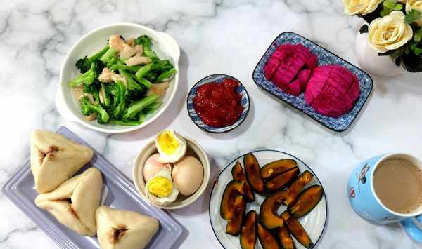 早餐四:奶咖、糖三角、蒸貝貝南瓜、西蘭花炒雞胸肉;早餐給孩子們準備瞭純牛奶,給自己沖瞭一杯無糖黑咖啡,加一點牛奶做成奶咖,我挺喜歡這種奶咖的味道,早上喝一杯也能提提神。